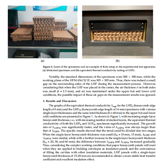 作為建筑材料領域的前沿研究,功能性蜂窩板(FHPs)在實際工程項目中的應用一直備受關注。為解決其傳熱性能優化難題,研究團隊采用熱流計法,針對總厚度 60mm 的層壓蜂窩板(LHPs)展開系統研究,深入探索不同結構參數對其傳熱性能的影響及內在傳熱機理。研究取得三大成果:一是明確當 LHP 的單層厚度較小時,其等效熱導率幾乎與細胞尺寸無關,據此提出采用 15-20mm 單層厚度作為 LHP 面板的優化方案;二是成功建立低壓堆傳熱模型,揭示出低壓堆的傳熱性能很大程度上取決于其蜂窩芯的性能,并進一步導出蜂窩芯穩態溫度分布方程;三是通過理論方程精細計算出每種傳熱方式對 LHP 總熱阻的貢獻,從理論層面清晰闡釋了影響低壓堆傳熱性能的內在機理。該研究成果為層壓蜂窩板(LDPs)在建筑圍護結構中的廣泛應用奠定了堅實的理論基礎,對推動建筑材料向高效節能、綠色環保方向發展具有重要意義。